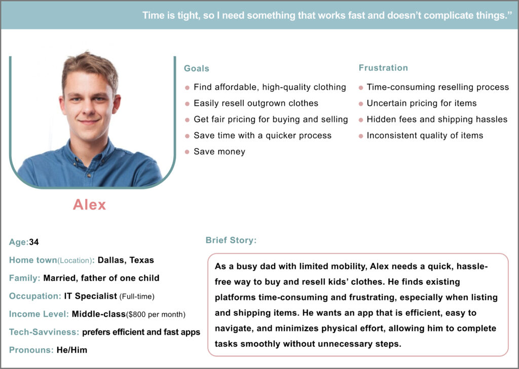Busy parents and guardians, including people with impairments, looking for a simple and accessible app to buy and sell kids’ clothes safely and easily.